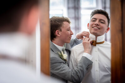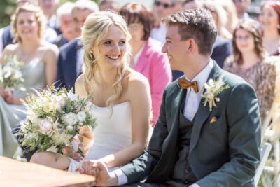 Bereits das Getting Ready von Philipp und Stefanie war ein wahrer Genuss! Eine ausgelassen fröhliche Stimmung und liebevolle Vorfreude durchzogen den Raum – einfach perfekt! Die Trauung fand im Freien statt und wurde durch persönliche Beiträge der Trauzeugen zu einem emotionalen und bewegenden Moment. Beim Sektempfang wurde direkt im Anschluss die Hochzeitstorte angeschnitten (die übrigens köstlich schmeckte!), bevor es zu den unterhaltsamen Gruppenfotos überging. Ein Highlight folgte dem nächsten.